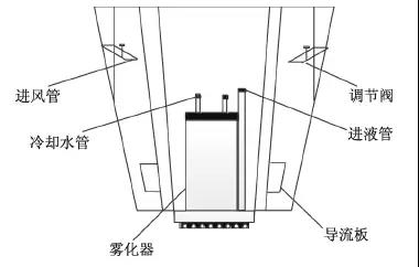 氣體分布器和霧化器的布置如圖3所示,熱空氣通過(guò)若干進(jìn)風(fēng)管和調(diào)節(jié)閥的控制均勻進(jìn)入進(jìn)風(fēng)通道中,通過(guò)導(dǎo)流板的調(diào)節(jié)呈一定角度旋轉(zhuǎn)并與旋流霧化器出來(lái)的霧滴進(jìn)行充分接觸和強(qiáng)烈的傳質(zhì)傳熱反應(yīng)。