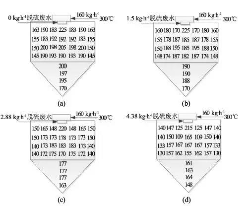 塔體溫度變化可以顯示不同區(qū)域內(nèi)脫硫廢水的蒸發(fā)特性,溫度下降越多,說(shuō)明此區(qū)域蒸發(fā)反應(yīng)越激烈。