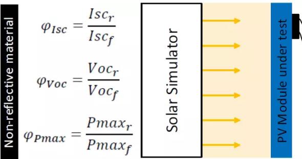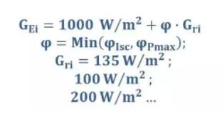 TÜV萊茵內(nèi)部標(biāo)準(zhǔn)2PfG 2645/11.17 中規(guī)定可以使用IEC 60904-1-2中的單面輻照和雙面輻照測(cè)試方法,不過(guò)目前在TÜV萊茵的實(shí)驗(yàn)室中使用的是單面輻照測(cè)試方法。除了BSTC下的測(cè)試,背面輻照度 (Gri) 為100W/sqm 和 200 W/sqm 時(shí)的IV測(cè)試結(jié)果也可以作為補(bǔ)充信息在測(cè)試報(bào)告中提供。 如下圖所示,單面輻照測(cè)試方法首先對(duì)雙面組件正反兩面分別在STC條件下進(jìn)行功率測(cè)試,然后再測(cè)試組件正面在等效輻照度(GEi)下的光伏特性。等效輻照度(GEi)由以下公式計(jì)算得出: