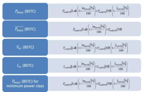 根據(jù)國(guó)際標(biāo)準(zhǔn)IEC 61215:2016的規(guī)定,光伏組件在進(jìn)行任何進(jìn)一步的測(cè)試之前都必須先穩(wěn)定其電性能。對(duì)于雙面組件,光致衰減(LID)等問(wèn)題依然存在并且不可忽視。因此,TÜV 萊茵2PfG 2645/11.17 建立了一套對(duì)BSTC下測(cè)得的光伏數(shù)據(jù)進(jìn)行銘牌驗(yàn)證的體系,該體系對(duì)于Pmax、Pmax 的平均值、 Voc 以及 Isc 的判定要求和 IEC 61215-1:2016中的一致。 并且該體系中增加了對(duì)于最低功率檔組件在BSTC下的 Pmax 的額外要求來(lái)保證最低功率檔組件的質(zhì)量。具體要求如下: